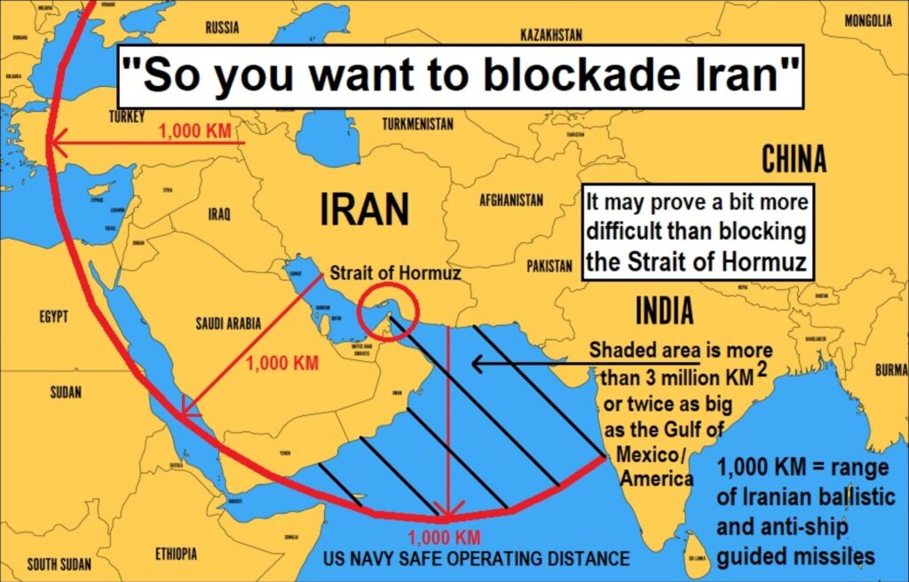 Iran has established what other call a blockade of the Straits of Hormuz, but is actually a tollbooth, allowing the ships of non-belligerants to pass through, for a price, but blocking the ships of hostile nations. It has stated that the tolls will provide for reconstuction of damaged infrastructure, in lieu of reparations which are unlikely to materialise. Thismis not an unreasonable position to take. In response, the American regime has decided to institute its own military blockade of shipping exiting the Straits, with their warships kept at a distance theoretically beyond the reach of Iranian missiles. It initially said that all shipping would be denied passage, but then clarified that it seeks to prevent any Iranian oil from being exported, and intends to commandeer any ship that has paid an Iranian toll.