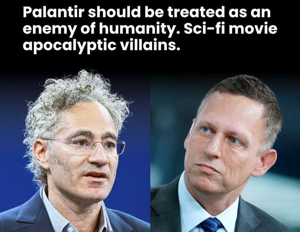 This power has already been used to deal death on a large scale, using Gaza as the testing ground. Specific individuals were targeted for even the most tangential connections to Hamas. They were monitored until returning home by a programme named “Where’s Daddy”, whereupon their entire apartment complex would be destroyed by a missile strike, killing potentially hundreds of people along with the intended target. It’s patently obvious that human life has no value to those who treat wars as a video game. Palantir has also been used to target undocumented immigrants in the US, allowing them to be seized and used as profit centres for the private prison system. Most of these people have lived their lives peacefully and paid their taxes, despite never being able to claim any benefits, but were targeted, often brutally, in any case. Palantir also bought the NHS health data in the UK and is now in control of that system, very much not to the benefit of the citizenry. It will be used to detect ‘pre-crime’, in other words identifying dissidents, categorizing them as terorrists, and incarcerating them for profit and forced labour. This is the most ruthlessly fascistic system ever developed, and it intends to take control of the entire world. Humans are to be used as non-player characters in a huge video game, where enormous casualties are a feature, not a bug.