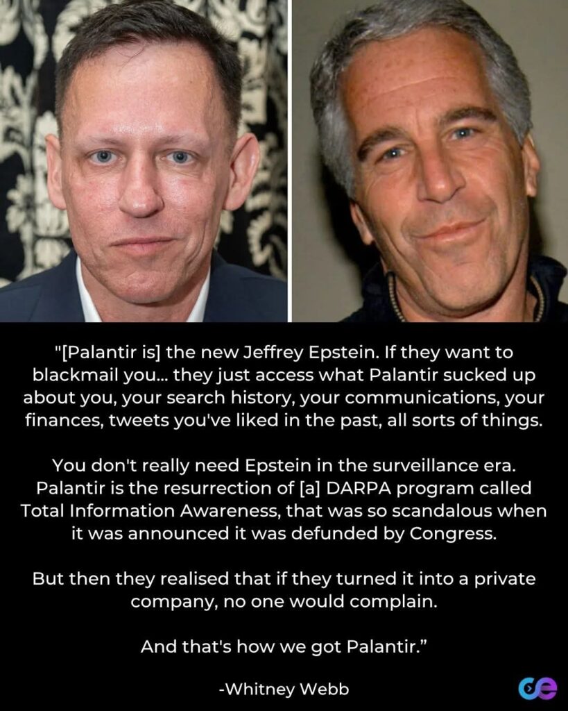 Palantir is the face of the developing technical industrial complex (TIC), which is currently challenging both the financial industrial complex (FIC) and the military industrial complex (MIC) for global domination. The technological control they’ve already achieved through the theft and integration of vast amounts of data on billions of individuals is staggering. Now they plan to use that power to gain monopolistic control over the entire population, as Founder Peter Thiel has long sought to do since giving up on the ideas of democracy and freedom years ago.