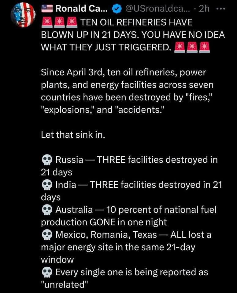 Chris goes into considerable detail as to the impacts of the war in the Gulf. Of course the actual situation will significantly worse, because the war with Iran will not end tomorrow, the war between Russia and Ukraine is also going to have an ongoing impact, and energy infrastructure, such as refineries and storage tanks, is being blown up all over the world with remarkable frequency. It beggars belief to think that these fires and explosions could be coincidental.
