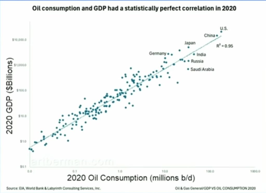 Chris Martenson is an excellent analyst. I strongly suggest following his work, starting with watching the video posted above. The graphs in this post come from the video. Subscribing to his channel, and his online community if you can afford it, is highly recommended. In this presentation, Chris goes through the math of what’s happening with the global oil market, and the implications for the future of the global economy. The picture is stark indeed. GDP is extremely tightly correlated with oil consumption, meaning that as available supply is cut, the economies of countries will be forced into contraction, with some countries faring better than others due to native supplies and refining capacity or lack thereof. Less lucky countries are going to suffer considerably, and in the relatively near future.