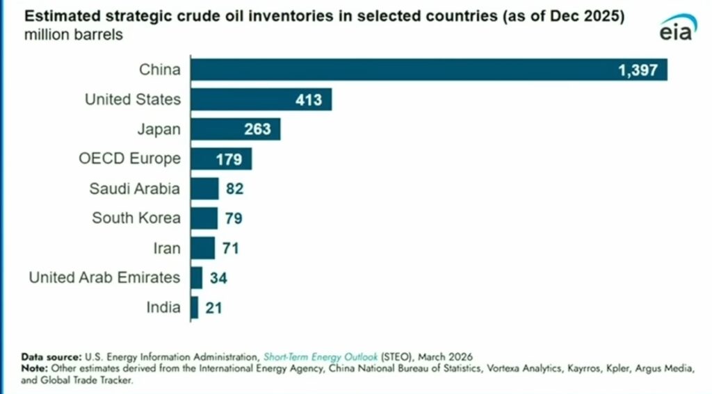 Refiners are currently working with their commercial reserves, which cannot fall below a critical level in order to keep oil flowing smoothly through the facility without sucking in air or sludge from the bottom of a tank. That critical minimum level is now being reached. As for strategic reserves, the total available for the four largest holders combined is about half of the number of missing barrels to date.